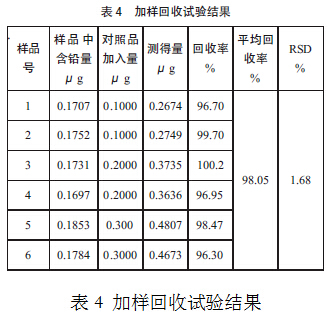 精密稱取已知鉛含量經(jīng)研細(xì)并過40 目篩的紅薯粉絲樣品0.5 g,共6 份,分別加入0.2000μg/mL的鉛標(biāo)準(zhǔn)溶液適量,按“2.1”項(xiàng)方法處理,照樣品測定方法測定其中的鉛含量,結(jié)果見表4。