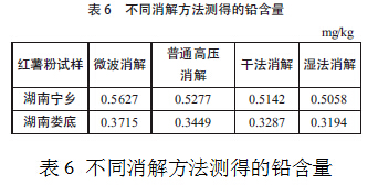 試驗(yàn)中曾對同一品質(zhì)的紅薯粉樣品采用微波消解、干法消解、普通高壓消解、濕法消解四種方法進(jìn)行處理,然后用原子吸收光譜法測定紅薯粉中鉛的含量(結(jié)果見表6),發(fā)現(xiàn)微波消解法效率最高。
