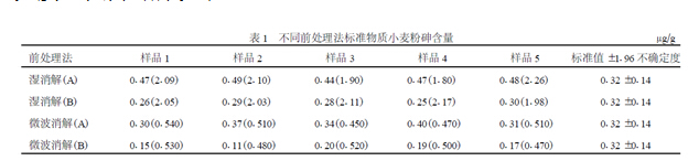 方法 采用濕消解法和微波消解法,在不同條件趕酸,用氫化物原子熒光光度法檢測標準物質(zhì)小麥粉中的砷含量,并與標準值比對。