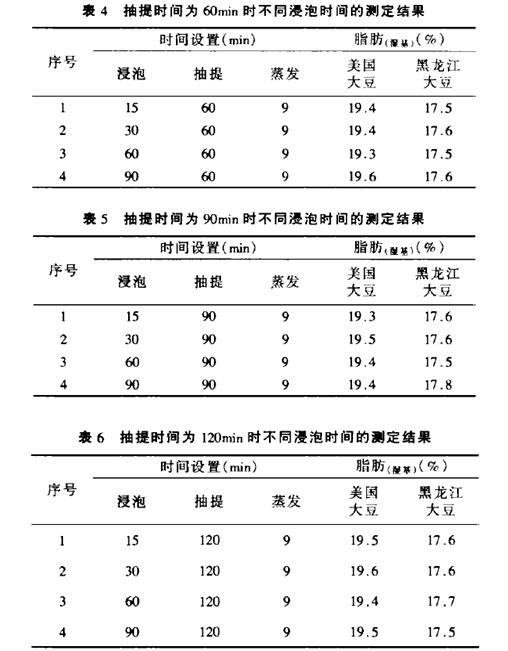 實驗表明,用自動脂肪測定儀測定大豆脂肪含量,粒度越小,脂肪浸提越容易,因粒度小的物料有較大的有效表面積,便于脂肪浸提,實驗磨可以獲得較小的粉碎粒度,能夠滿足實驗要求。足夠長的浸提時間,可以得到與國標法相同的結果,但在實際工作中,在保證獲得準確數(shù)據(jù)的同時,時間要越短越好。大豆樣品用實驗磨粉碎后,用自動脂肪測定儀測定脂肪含量,用石油醚(30-60℃)做溶劑,浸泡時間設置為30min,抽提時間設置為60min,就可以取得與國標法相同的結果。傳統(tǒng)的索氏抽提法測定大豆脂肪需10h以上時間,而自動脂肪測定儀進行提取僅需3h,縮短了測定時間,提高了工作效率。