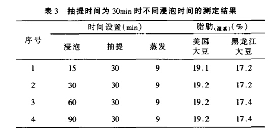 從表3-6中可以看出,浸泡時間的長短對測定結果的影響并不明顯,浸泡的目的就是讓樣品中的油脂擴散到溶劑中,在抽提過程中,油脂就可以順利地從試樣中分離出來。用自動脂肪測定儀測定大豆脂肪含量,浸泡時間為30min可以滿足實驗的要求,過多地延長浸泡時間沒有太多的意義。