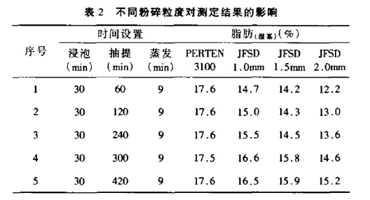 從表2中可見,實驗磨比普通粉碎機制備的樣品浸提效果要好。粒度的大小直接影響浸提的效果,粒度越小,脂肪測定所需時間越短。粒度越大,測定所需時間越長,結果也偏低。