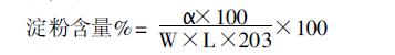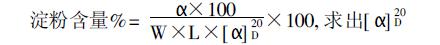 稱取磨細的烘干樣品2.5000g于離心管中,取鮮樣測水份,先用石油醚脫脂, 后加入86% 酒精150ml攪拌幾分鐘,上離心機離心,抽掉上清液。再用石油醚150ml 分三次攪拌幾分鐘,上離心機離心,去掉上清液,將離心管底部沉淀物用60mlCaCl2-HAc 溶液完全洗入250ml三角瓶中, 在118±1℃的恒溫甘油浴中恒沸半小時,取出冷卻,完全洗入100ml 容量瓶中,加1ml ZnSO4 溶液搖勻,再加1ml 亞鐵氰化鉀溶液,搖勻,用水定容。用慢速濾紙過濾, 濾液倒入旋光儀旋光管中, 在旋光儀上讀出旋光度, 代入以下公式求出淀粉的百分含量: