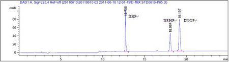 圖1,圖2,圖3,圖4分別是塑化劑對(duì)照品(DBP\DEHP\DNOP)、番石榴果汁樣品(不含塑化劑)、果汁樣品加標(biāo)、A品牌果汁樣品的檢測(cè)圖譜。