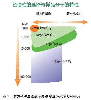 形成疏水相的烴基通常是十八碳(C18)、八碳(C8)或四碳(C4)的線性脂肪族烴。烴鏈的長度在蛋白質分離效果上一般沒有什么不同。分離給定大小和疏水性的多肽時哪種固定相可能最有效有規(guī)可循,參見圖7中的總結。對于肽和少于5000道爾頓的小分子蛋白質最好選用C18色譜柱。最小的分子和最親水的肽通常在小孔的C18柱子上分離得最好。大于5000道爾頓的蛋白質或小分子多肽非常疏水,最好選用C4色譜柱。C8柱與C18色譜柱的應用差不多,但分離個別肽時有時表現出不同的選擇性和分離能力。苯基柱沒有C4柱子那么疏水,所以對有些多肽表現出獨特的選擇性。