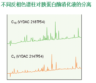 不同的反相吸附劑在分離蛋白質酶消化物中的肽碎片時可能表現出不同的選擇性。用兩種RP-HPLC色譜柱分離β-乳球蛋白A的胰蛋白酶消化物碎片,結果表明:不同的相有時對肽的反相分離具有微小的影響(圖10)。與通常使用的C18色譜柱相比,C4柱的保留時間稍短,肽碎片洗脫圖形也有某些程度上的不同。測試不同的色譜柱是確定哪個柱子分離度最好的唯一實用的方法。有些實驗室利用反相色譜柱的選擇性差異來進行肽的二維分離。