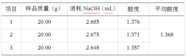 根據(jù)此表可知,自動(dòng)滴定儀采用預(yù)設(shè)終點(diǎn)滴定法,預(yù)設(shè)滴定終點(diǎn)pH:8.3,預(yù)控點(diǎn):8.0,預(yù)控量:40%,延時(shí)時(shí)間:10S,測(cè)定結(jié)果重復(fù)性良好,同時(shí)節(jié)省時(shí)間,方便快捷。