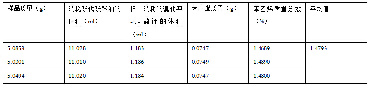 運用返滴定法。首先加入定量且過量的溴化鉀-溴酸鉀溶液,攪拌待苯乙烯與溴單質加成反應完成后,加入過量碘化鉀,溶液中生成碘單質,使用硫代硫酸鈉滴定其中的碘單質。