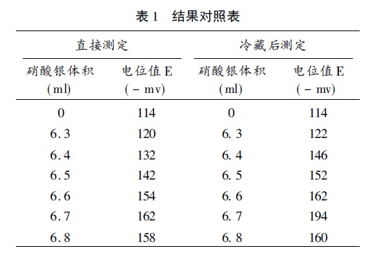 用硝酸銀標準溶液直接滴定, 在接近終點時電位漂移,不易確定。而改用返滴測電位恒定, 終點易辨別。由于電解液介質不完全相同, 突躍電位介于- 170~ - 190mv 之間。