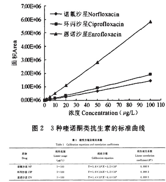 配制濃度為1、2、5、10、20、50和100ug/L 3種喹諾酮類的標(biāo)準(zhǔn)液,測定其峰面積,并做面積與濃度工作曲線(圖2)。結(jié)果表明,諾氟沙星、環(huán)丙沙星和恩諾沙星的1~100ug/L濃度與其峰面積呈良好的線性關(guān)系,其相關(guān)參數(shù)見表1。