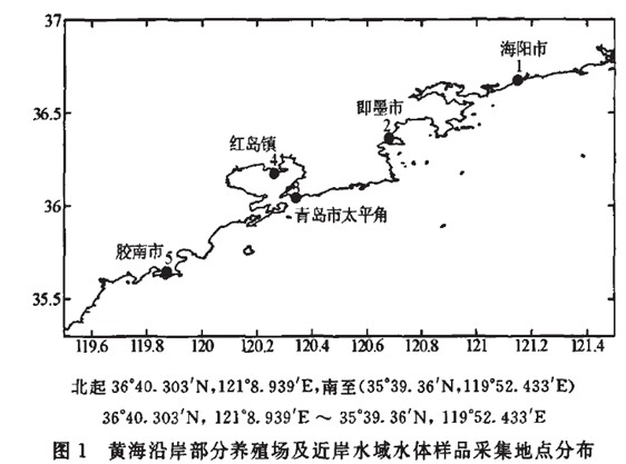 海水樣品采自黃海近岸海水養(yǎng)殖區(qū),包括5個(gè)采樣點(diǎn)(圖1):山東省海陽市大閻家鎮(zhèn)某半滑舌鰨養(yǎng)殖場;山東省即墨市鰲山衛(wèi)鎮(zhèn)某大菱鲆養(yǎng)殖場;青島市太平角海區(qū);青島市紅島灘涂養(yǎng)殖區(qū);山東省膠南市瑯琊鎮(zhèn)某海參養(yǎng)殖場。分別用玻璃取樣瓶在每個(gè)采樣點(diǎn)采集500 ml表層海水,4℃密封保存,經(jīng)0.45um醋酸纖維濾