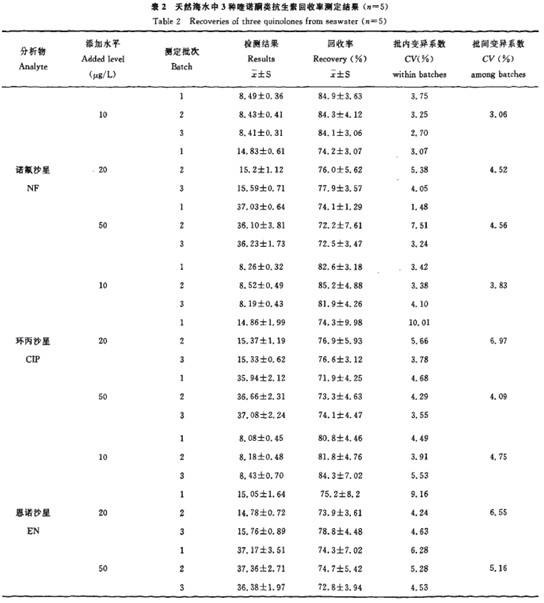 取空白海水為試驗(yàn)對象,測定3種喹諾酮類的添加濃度在10~50弘g/L時(shí)的回收率和變異系數(shù)(表2);厥章示71.9%~85.3%之間,批內(nèi)變異系數(shù)均≤10%,批問變異系數(shù)≤7%。