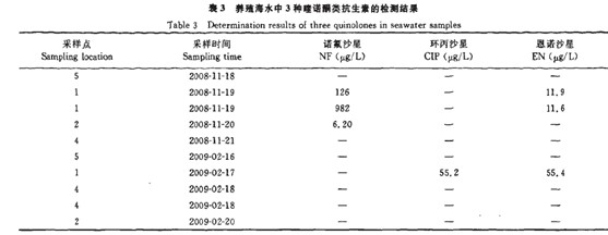 分析了10份采自不同海域的養(yǎng)殖海水,結(jié)果見表3。譚建華等(2007)利用固相萃取的方法分析了珠江廣州河段的城市河水,檢測到諾氟沙星和環(huán)丙沙星的質(zhì)量濃度范圍為0.197,'一0.510/堅(jiān)g/L,說明人們?nèi)粘I钪幸灿?種喹諾酮類抗生素;本試驗(yàn)對黃海沿岸部分養(yǎng)殖場及近岸海水分析,有養(yǎng)殖海水檢測到3種喹諾酮類抗生素,而近岸海水未檢測到3種喹諾酮類抗生素。這說明大水域生態(tài)系統(tǒng)由于面積大、范圍廣,更有利于稀釋、降解抗生素。養(yǎng)殖海水中檢出喹諾酮類抗生素的原因可能是:(1)3種喹諾酮類抗生素藥物仍在使用。藥物的不規(guī)范使用是導(dǎo)致水環(huán)境中存在檢出藥物的重要原因(王朋華等2008);(2)殘留在海水中的未代謝藥物。水生動(dòng)物用藥后,藥物以原形或其代謝物的形式通過糞便和尿液排到體外,繼而對海水造成污染;(3)殘留在海底底泥中未代謝的藥物。Kiimmerer(2001)報(bào)道環(huán)丙沙星進(jìn)入水體后,會(huì)被沉積物吸附,有65%進(jìn)入到污泥中。