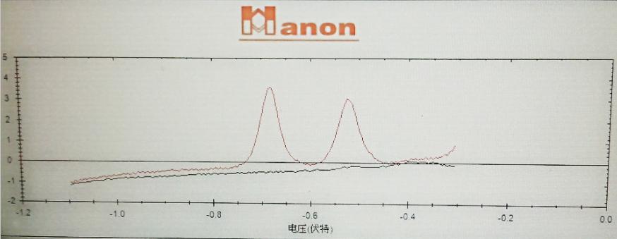 圖1 水樣中重金屬鉛鎘的測試結(jié)果(黑色線為水樣,紅色線為加標(biāo))