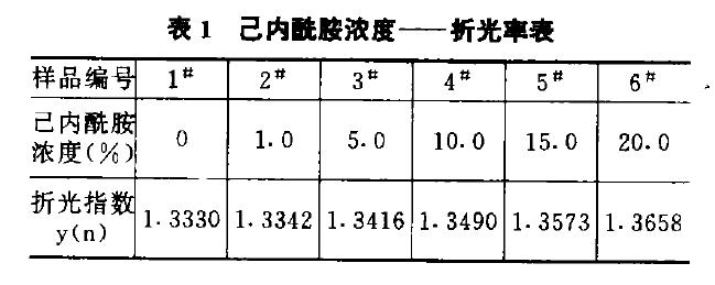 本文介紹的測定己內(nèi)酸胺含量的方法為折光指數(shù)的儀器分析法, 其原理是利用己內(nèi)酞胺水溶液的折光指數(shù)在一定條件下隨其濃度的變化而不同, 通過具體的試驗求出其折光指數(shù)對濃度的變化規(guī)律, 并繪制試驗曲線。本試驗結(jié)論和計算結(jié)果證實了在己內(nèi)酞胺濃度小于20 % 時, 其折光率一濃度的變化規(guī)律為一直線, 而且線性相關(guān)顯著, 測量過程中隨機誤差可以忽略不計。從而提供了一種簡便、快速、準確、實用的己內(nèi)酞胺含量測定方法。