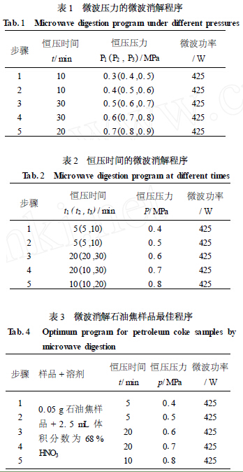 2. 2. 6 微波消解石油焦樣品最佳程序 通過以上各條件的考察,得出石油焦樣品的最佳微波消解程序,列于表3 中。