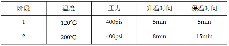 在消解罐中稱取 500 mg 樣品,加入 4.0 mL HNO3,4.0 mL HF。小心搖動混合物。在消解罐蓋蓋前至少等待10 分鐘,然后按照以下程序在微波消解系統(tǒng)中加熱。