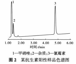 對11 份市售祛痘除螨類化妝品的分析表明,2 份檢出氯霉素,檢出質(zhì)量分數(shù)分別為0.37% 和0.19%;1 份檢出甲硝唑,質(zhì)量分數(shù)為1.02%;鹽酸米諾環(huán)素、鹽酸土霉素、鹽酸四環(huán)素、鹽酸金霉素、鹽酸多西環(huán)素未檢出。圖2 為同時檢出甲硝唑和氯霉素的某陽性樣品色譜圖,峰2 保留時間為1.35 min,為雜質(zhì)出峰,不影響對峰1 甲硝唑的定性。