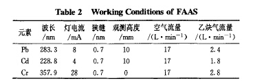 火焰原子吸收光譜法(FAAS)分析條件見表2。按表2儀器參數(shù)分析鉛、鎘元素的標(biāo)準(zhǔn)溶液和樣品待測液。同時(shí),測定方法檢出限、加標(biāo)回收率和精密度。鉛、鎘的吸光度隨觀測高度增大而變大,因而選用儀器最高的觀測高度;鉻元素的吸光度隨觀測高度增大而變小,因而選擇最低的觀測高度。鉛的燈電流大于8 mA時(shí)靈敏度急劇下降,為了獲得較高精密度,選擇大電流。鎘元素?zé)綦娏鳛?~5 mA時(shí),靈敏度下降,在4 mA時(shí)靈敏度和精密度均較好。鉻元素?zé)綦娏髟?8 mA時(shí),靈敏度略有下降,但是精密度變好,標(biāo)準(zhǔn)曲線重現(xiàn)性和穩(wěn)定性好。分析鉛元素時(shí),乙炔氣流量從1.0增大到2.8 L·rain-1時(shí),吸光度有一定增加,選擇2.4 L·min_1即可使標(biāo)準(zhǔn)曲線達(dá)到較高靈敏度和較好重現(xiàn)性。鎘元素的乙炔氣流量在1.5
