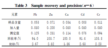 為了驗證方法的可靠性,進行了加標(biāo)回收試驗。在樣品中分別分組添加各種待測元素的標(biāo)準溶液,進行加標(biāo)回收試驗,結(jié)果見表3 。