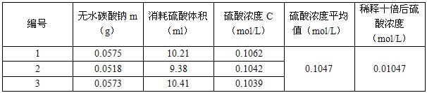 (1)硫酸標(biāo)準(zhǔn)溶液[C(1/2H2SO4)=0.01mol/L]的配制:用移液管移取1.50ml濃硫酸,稀釋到500ml容量瓶,定容。稱取已灼燒的基準(zhǔn)無水碳酸鈉0.05g,轉(zhuǎn)移至錐形瓶中,加50ml蒸餾水溶解,加入5滴混合指示劑,用配制的硫酸進(jìn)行滴定。準(zhǔn)確移取100ml已標(biāo)定的硫酸溶液,稀釋到1000ml容量瓶,定容。