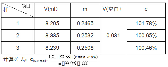 ·滴定劑:c(HClO4)=0.1011mol/L, 滴定劑的濃度用基準(zhǔn)物質(zhì)鄰苯二甲酸氫鉀標(biāo)定。