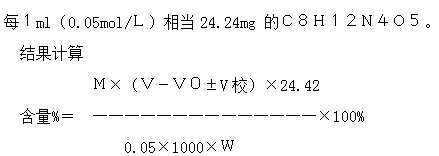 精密稱(chēng)取0.15g規(guī)格2.0g;0.1g規(guī)格2.4g;50mg規(guī)格4.8g,置凱氏燒瓶中,加水250ml ,振搖使溶解,沿瓶壁加入40%氫氧化鈉溶液75ml,使自成一層液層,加鋅粒數(shù)粒,用氮?dú)馇驅(qū)P氏燒瓶與冷凝管相連接;另取2%硼酸溶液50ml ,置500ml錐形瓶中,加甲基紅-溴甲酚綠混合指示劑10滴,將冷凝管的下端插入硼酸溶液的液面下,輕輕搖動(dòng)凱氏燒瓶,使溶液混合均勻,加熱蒸餾至接受液的總體積約為250ml時(shí),停止aa蒸餾。將冷凝管尖端提出液面,純化水少量沖洗管尖內(nèi)外壁,餾出液用硫酸(0.05mol/L)滴定至溶液由藍(lán)綠色變?yōu)榛易仙,并將滴定的結(jié)果用空白試驗(yàn)校正。