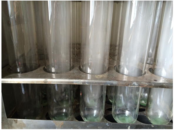 樣品消解:先揮去大部分水分,防止上沖;為避免硫酸過量損失,防止消化管燒干,可用玻璃漏斗代替排廢罩。消解過程中注意觀察,消解澄清后30min停止加熱。