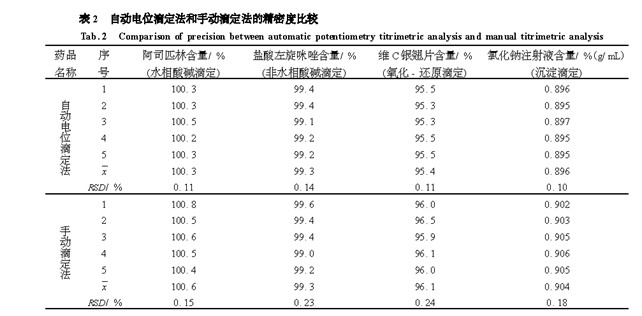通過4 種代表不同反應類型的藥物含量比較,自動電位滴定法測定結果得到的RSD 值明顯小于手動滴定法,實驗重現(xiàn)性更好,精密度高。