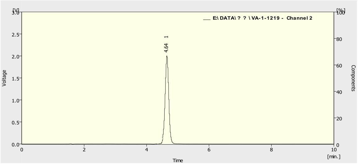 本實(shí)驗(yàn)采用反相高效液相色譜法進(jìn)行測(cè)定,出峰時(shí)間4.64min,與文獻(xiàn)參考值一致。
